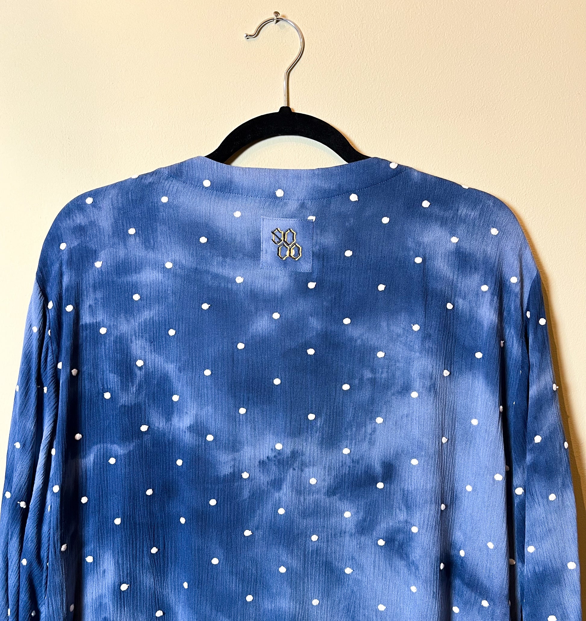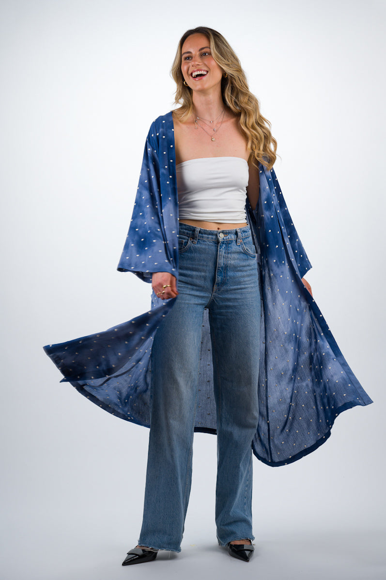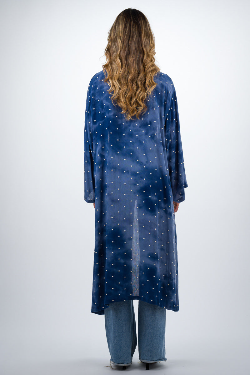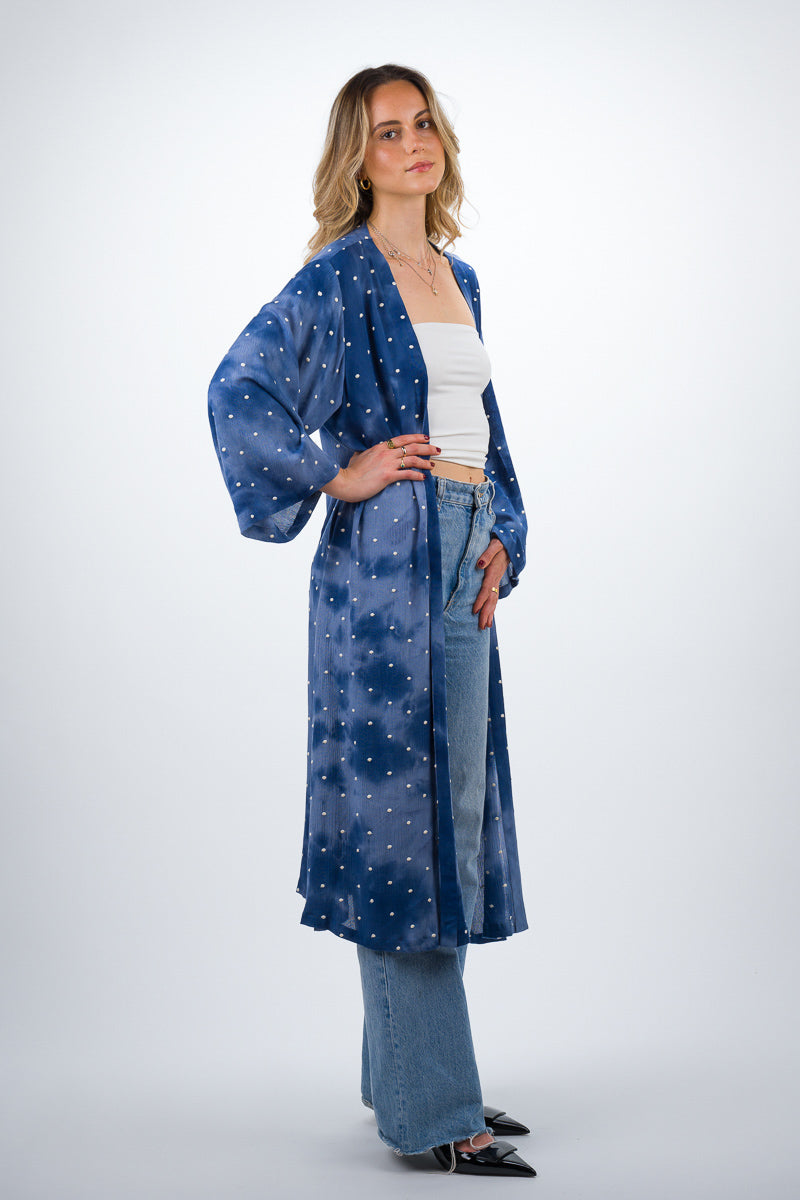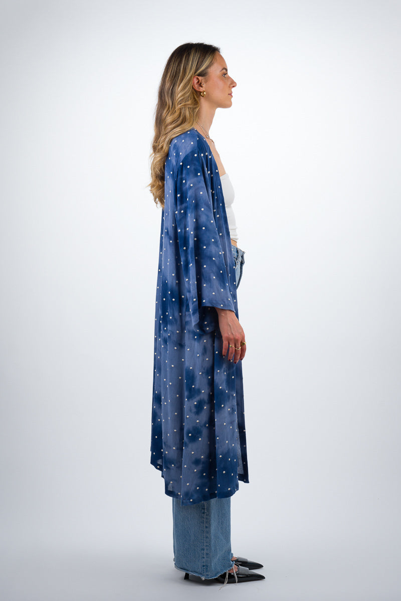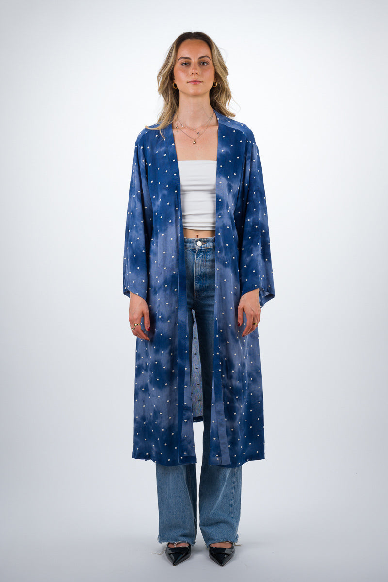 Il kimono "Clotilde" è realizzato con una mussola di cotone azzurro pregiato che dona al capo un gioco di nuances di colore tone sur tone. I pois sono ricamati con un filato ritorto che impreziosiscono il tessuto rendendogli un effetto tridimensionale.