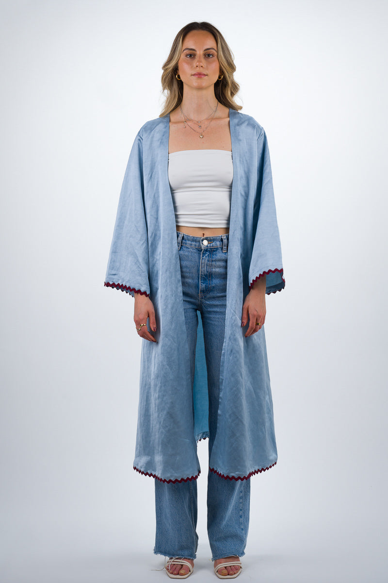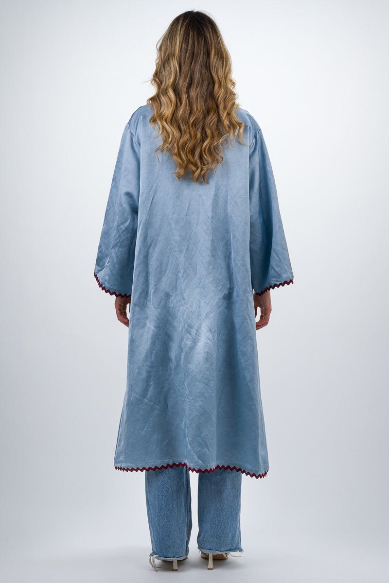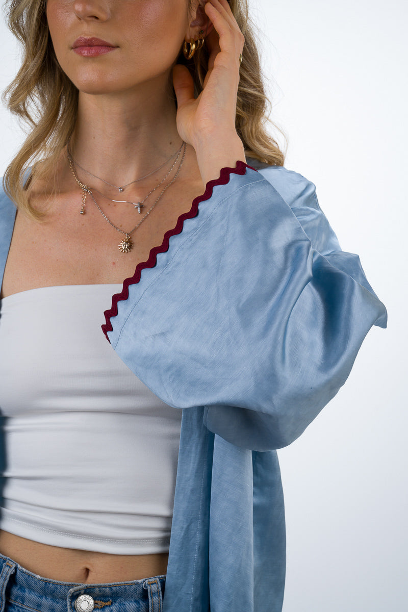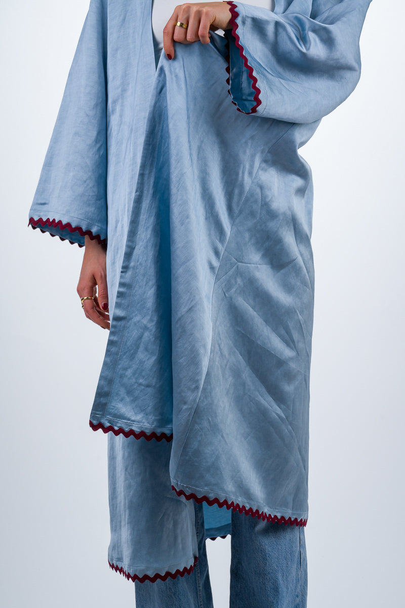 Il kimono "Patrizia" è realizzato con un tessuto doppiato viscosa/lino che dona al capo lucentezza ed un movimento di increspature tipiche della naturalezza del lino. Il kimono è impreziosito da una bordatura in passamaneria ondulata bordeaux.