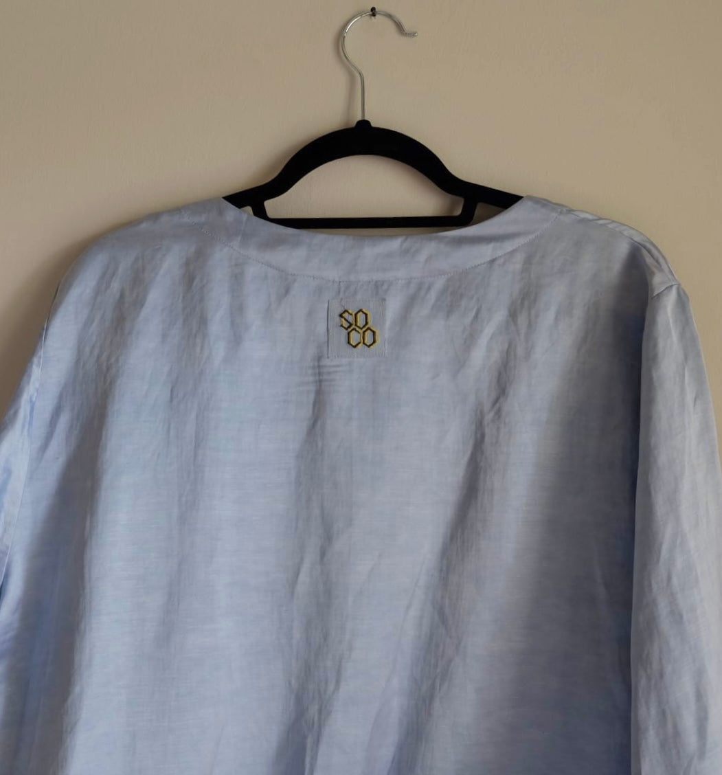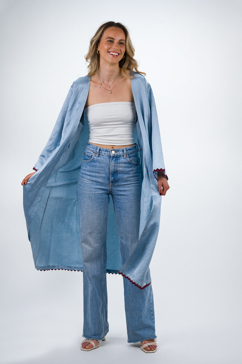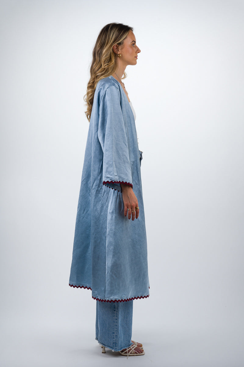 Il kimono "Patrizia" è realizzato con un tessuto doppiato viscosa/lino che dona al capo lucentezza ed un movimento di increspature tipiche della naturalezza del lino. Il kimono è impreziosito da una bordatura in passamaneria ondulata bordeaux.